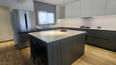 Large, fully renovated kitchen with central island and extensive storage