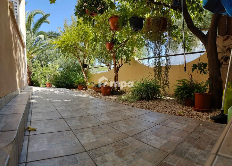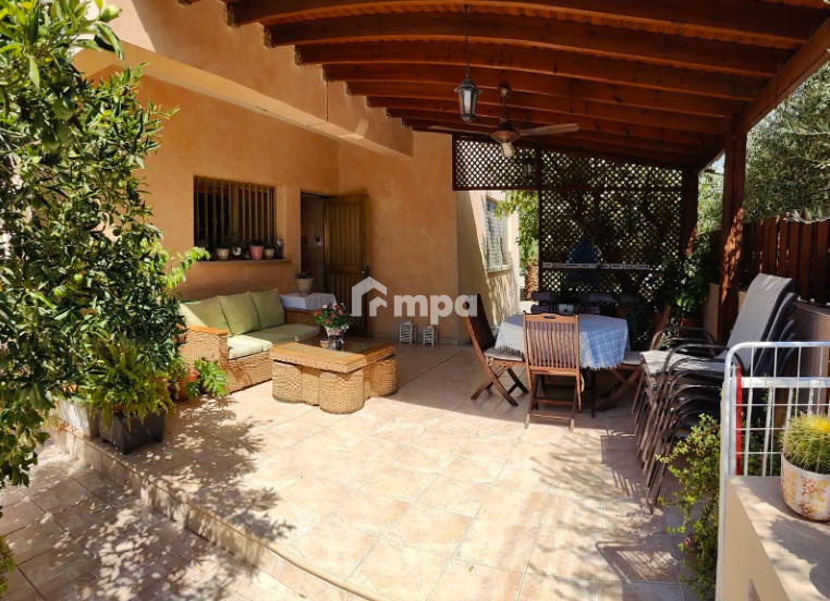 Outside, the home offers a generous garden with ten mature olive trees, a wooden pergola, two covered parking spaces, and plenty of space for outdoor living.