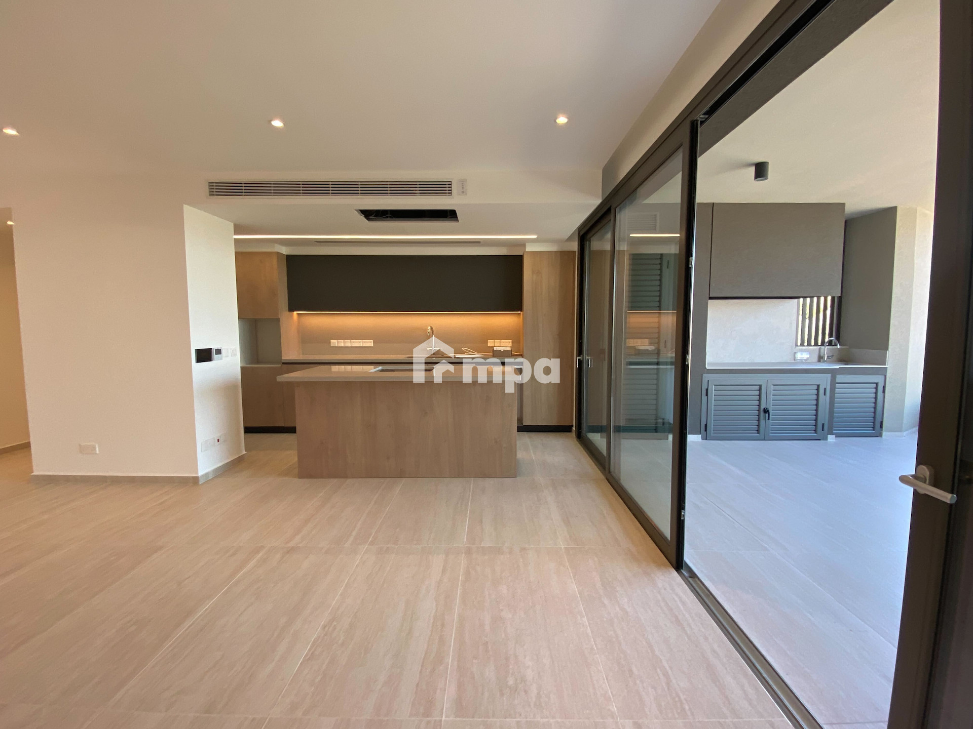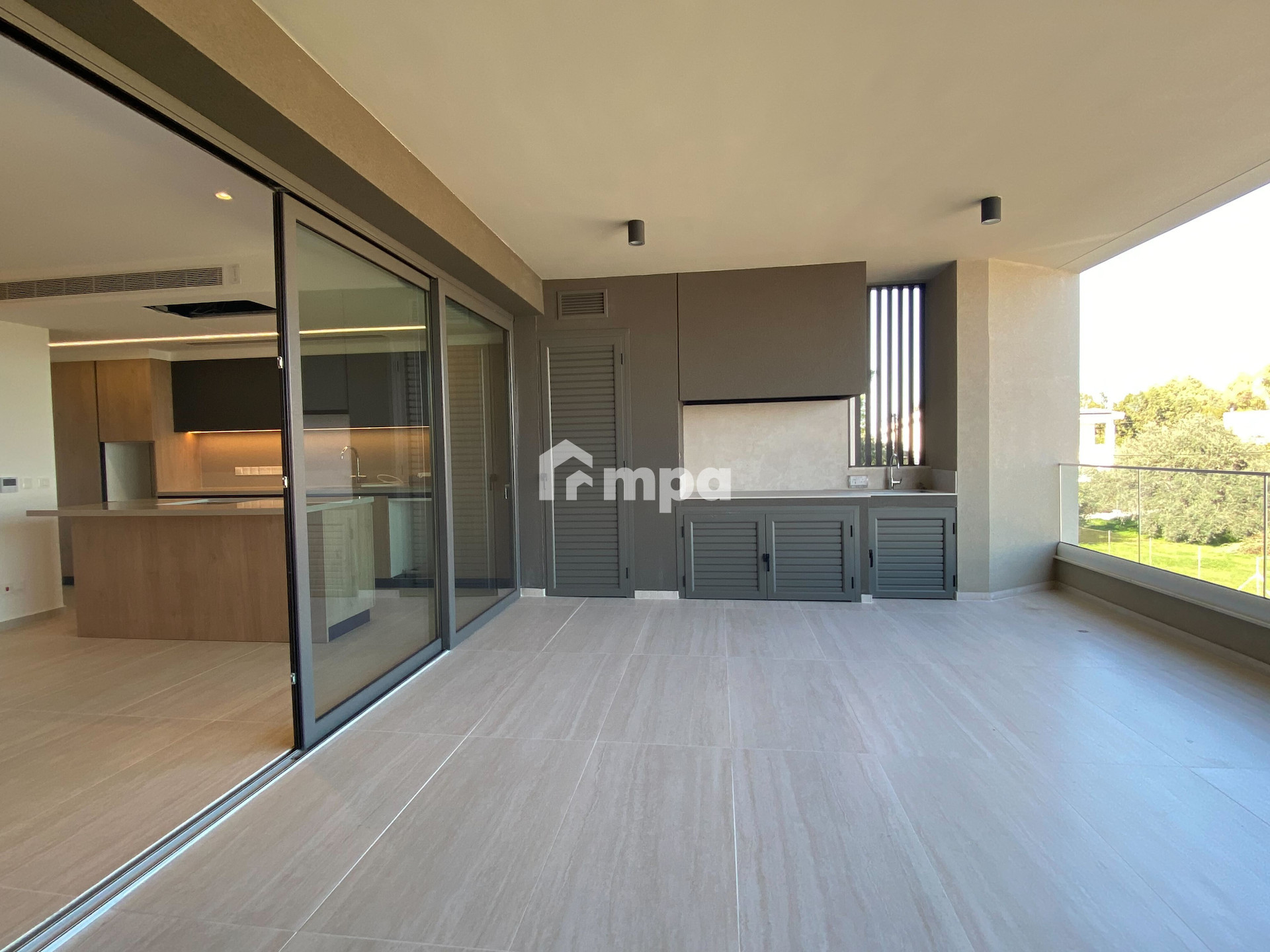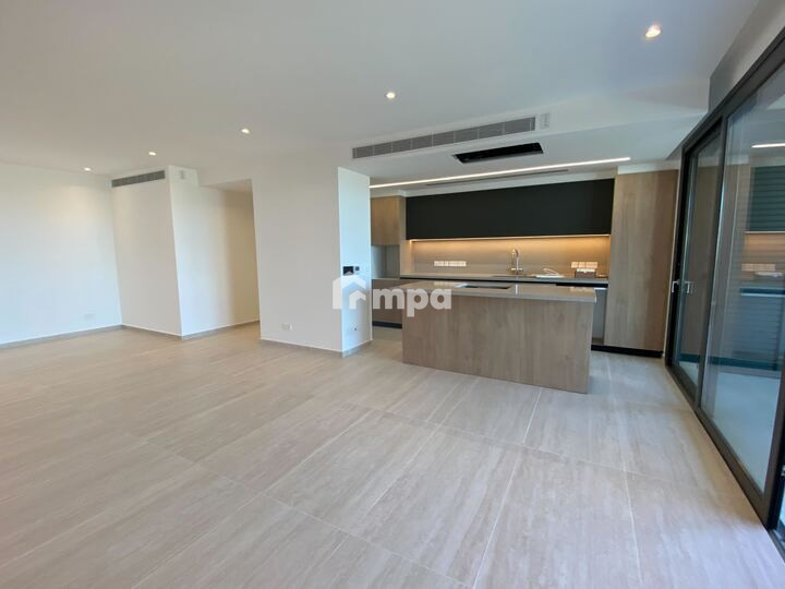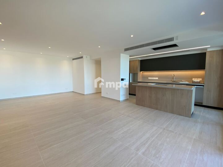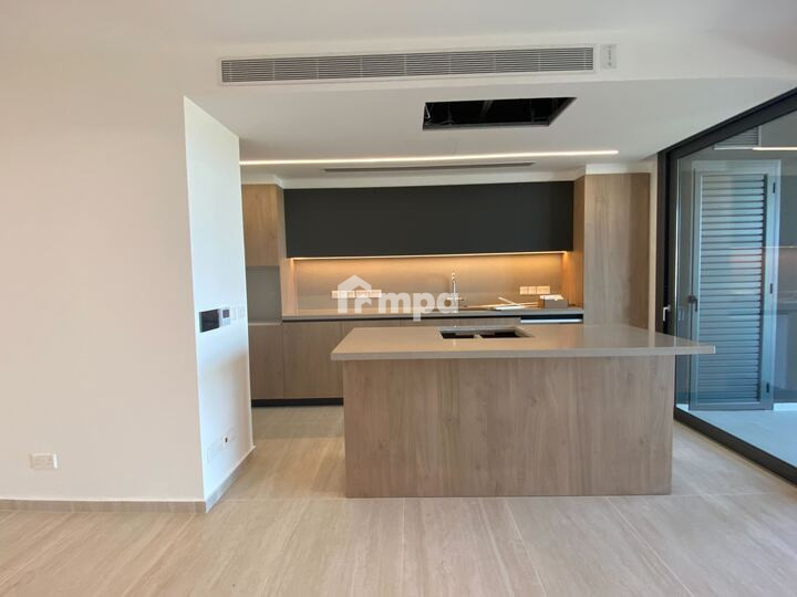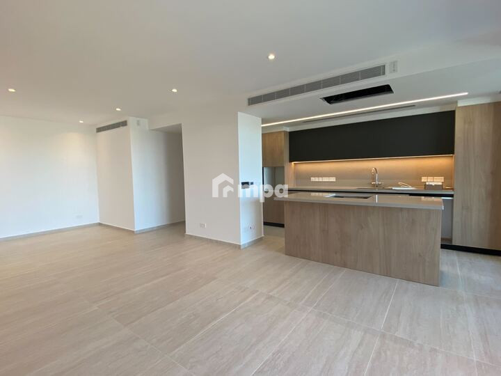 The apartment offers 136 sqm of internal space, an open-plan kitchen with high-end appliances, a spacious living area, and premium finishes throughout.